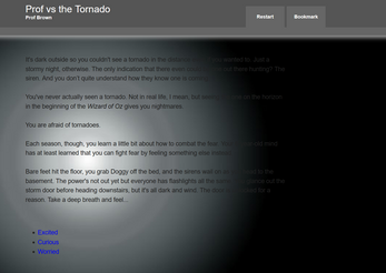 Inspired by a visit to my hometown in Kentucky as an adult where storms caused massive pain flare-ups for me (fibromyalgia), this is a story about remembering how I coped with a fear of tornadoes over the years. It was made for Ludum Dare 32 (theme: An Unconventional Weapon) and is my first Twine game. This game was featured in the 2015 WordPlay Festival.